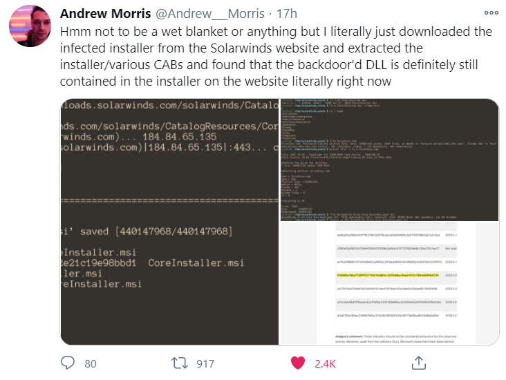 Andrew Morris, founder of the security firm GreyNoise Intelligence, on said that as of Tuesday evening SolarWinds still hadn’t removed the compromised Orion software updates from its distribution server.