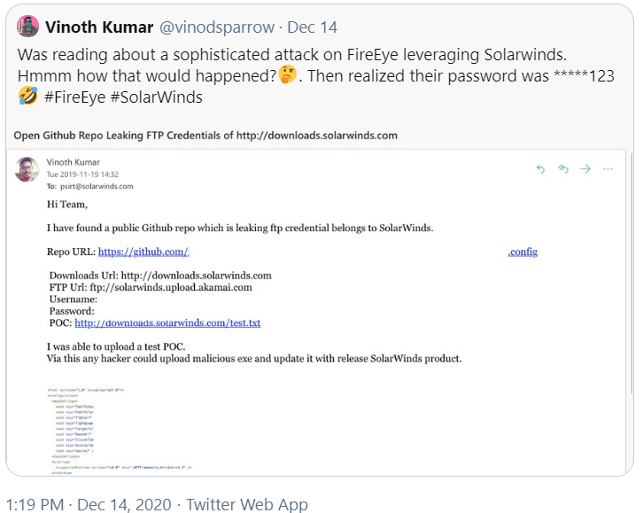 Some of the legal and regulatory fallout may hinge on what SolarWinds knew or should have known about the incident, when, and how it responded. For example, Vinoth Kumar, a cybersecurity “bug hunter” who has earned cash bounties and recognition from multiple companies for reporting security flaws in their products and services, posted on Twitter that he notified SolarWinds in November 2019 that the company’s software download website was protected by a simple password that was published in the clear on SolarWinds’ code repository at Github.