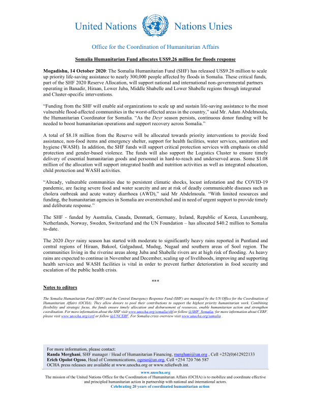 Randa Merghani, SHF manager / Head of Humanitarian Financing, [email protected] , Cell +252(0)612922133 Erich Opolot Ogoso, Head of Communications, [email protected], Cell +254 720 766 587 OCHA press releases are available at www.unocha.org or www.reliefweb.int.