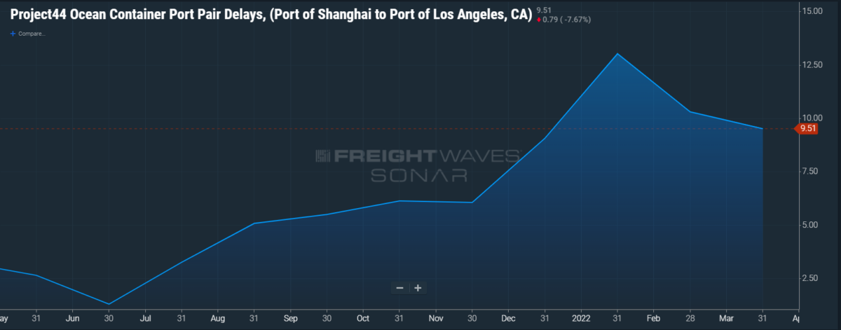 Once the container is out on the water, it has to wait yet again once it arrives at its destination port. The Port of Los Angeles receives the most containers from Shanghai, which is why only Los Angeles is shown on the SONAR chart below. Notice another nine-plus days of waiting. More time is being lost.