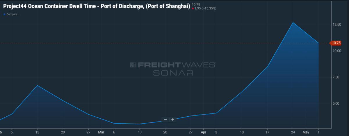 The first shows container dwell time at the Port of Shanghai. Sure, it’s great you can get your product in a container, but you will have to wait more than 10 days for it to get loaded on a vessel. A container at rest is not making money.