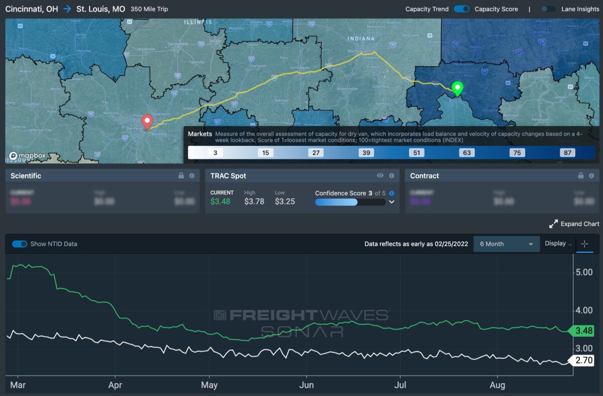 The Outbound Tender Volume Index in Cincinnati is up more than 13 points, or 12.7%, since last week. Spot market rates from Cincy to St. Louis have been consistent in the past three months at or around $3.48 a mile — 78 cents above the national average. Not a bad place to land, as the Headhaul Index is up 65% in Cincy over the past week.