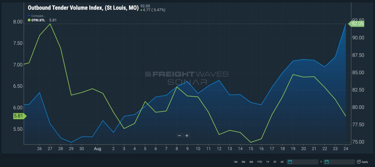 Outbound tender volumes in St. Louis are climbing steadily this month. Since Aug. 2, the Outbound Tender Volume Index is up 16 bps, or 20.3%.