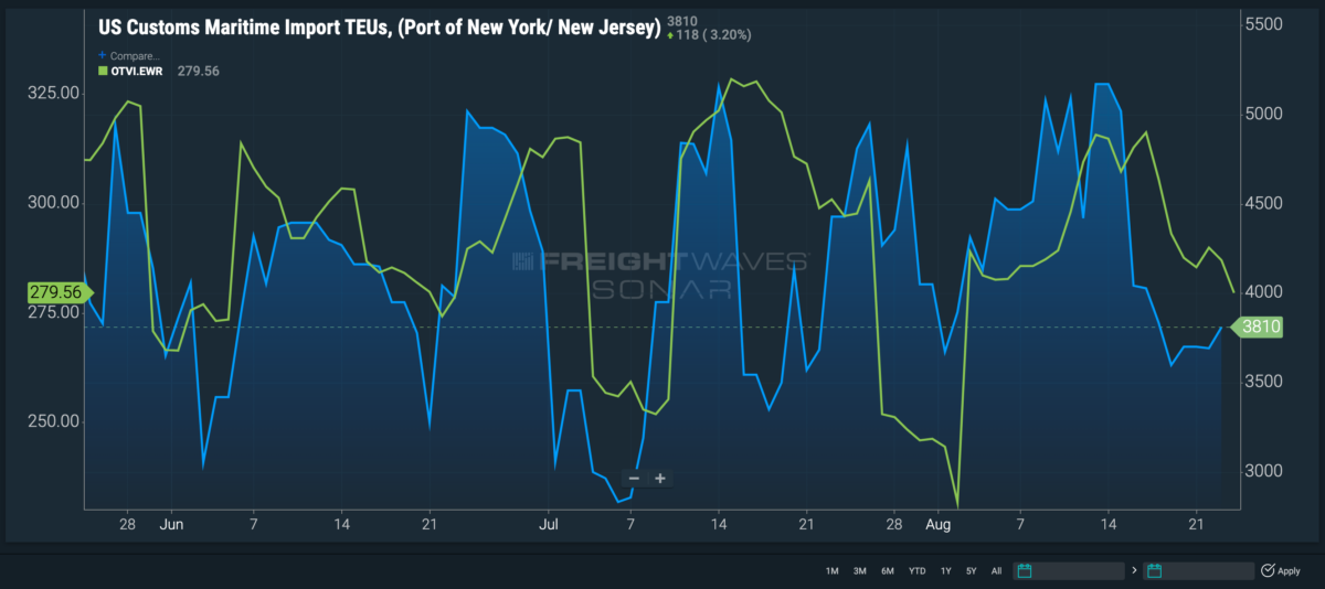 The Outbound Tender Volume Index in Elizabeth is down for the eighth day in a row, falling 10.5 basis points, or 4.1%, since the start of the slump. Containerized imports at the Port of New York and New Jersey are ticking up after a steep drop. In the last six days, maritime imported twenty-foot equivalent units are up 5.9%.