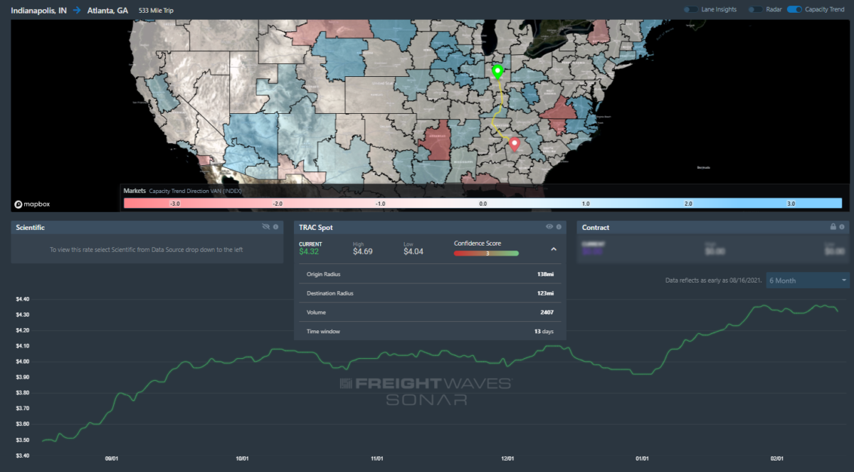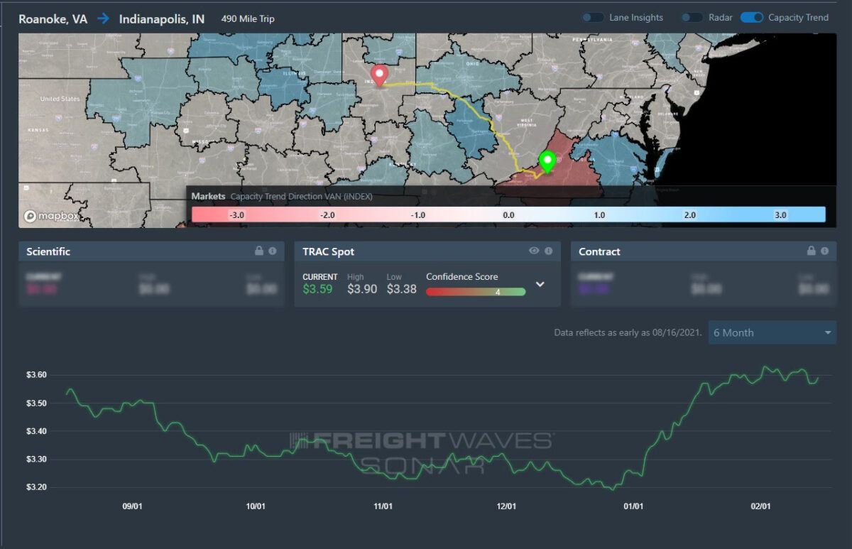 Brokers: If bidding for this lane, focus on commodity and weight, because the routing through West Virginia can be difficult for carriers if weights are in excess of 43,000 pounds. In addition, winter conditions appear to be a contributing factor to higher seasonal spot rates. The rising tender rejections from the Roanoke market and declining rejections in the Indianapolis market could present greater margins if you find the right backhaul carrier for this lane.
