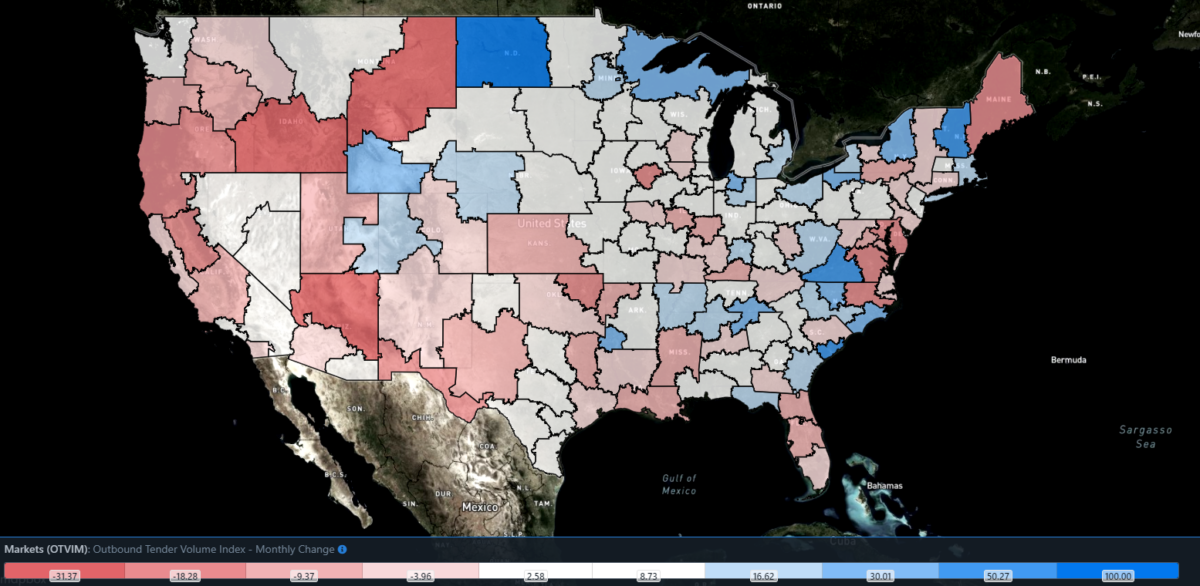 The Outbound Tender Volume Index – Monthly Change signals which markets are experiencing prolonged volume growth (or contraction).
