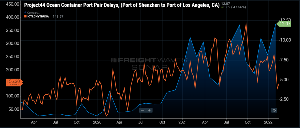 • Ocean containers port pair delays from Yantian to LAX (the difference between expected transit time and actual transit time) are up to 12 days on average in January 2022.