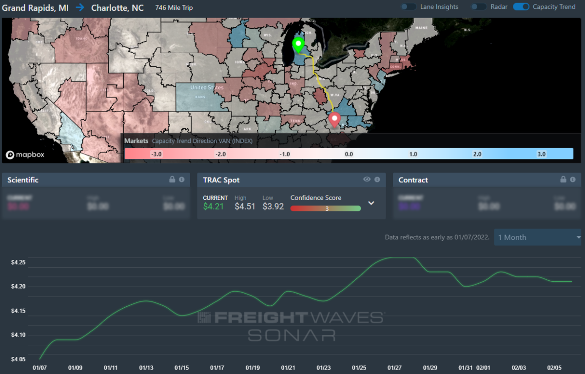 Brokers: Be wary of delayed spot rate increases that will likely follow the sharp increase in rejections at the end of last week. Some rates may increase sharply as general capacity is disrupted, so consider getting rates at or below $4.44 per mile a good deal in this lane.