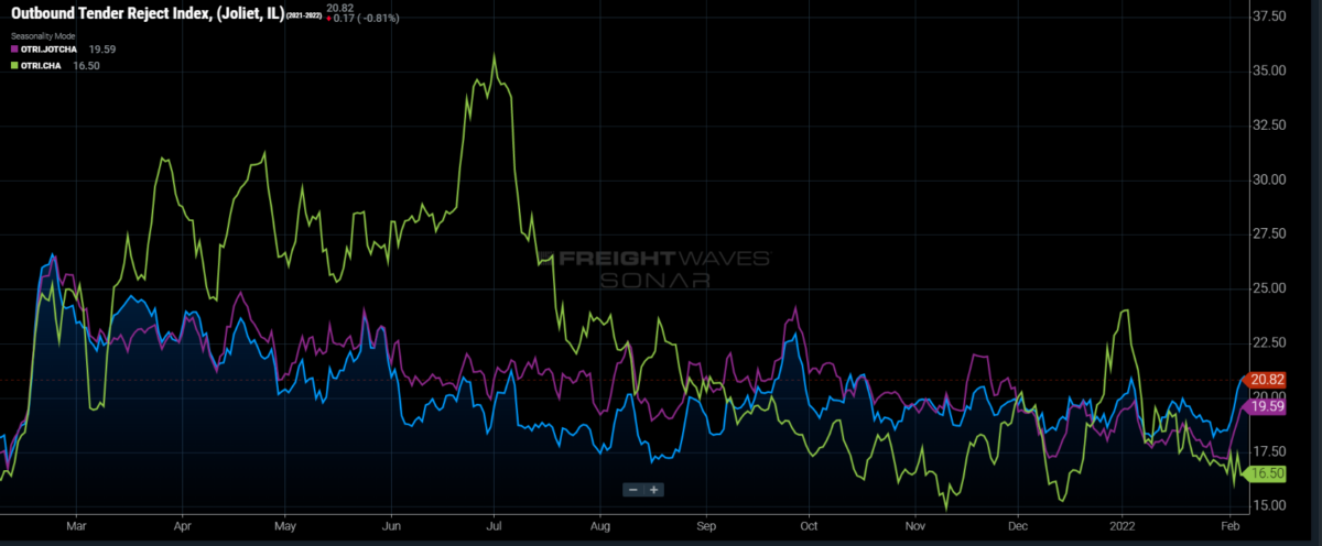 • Joliet’s outbound rejection rate jumped back over 20% this past week to its highest value since just after the New Year.