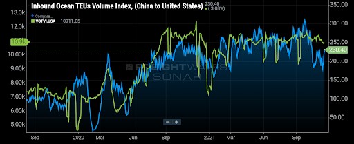 Inbound Ocean TEUs Volume (China to U.S.) vs. Van Outbound Tender Volumes (USA)