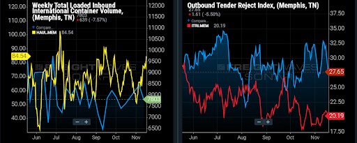 - Memphis outbound tender rejections are down 4.4% w/w, but that trend is likely to accelerate as demand for capacity increases.