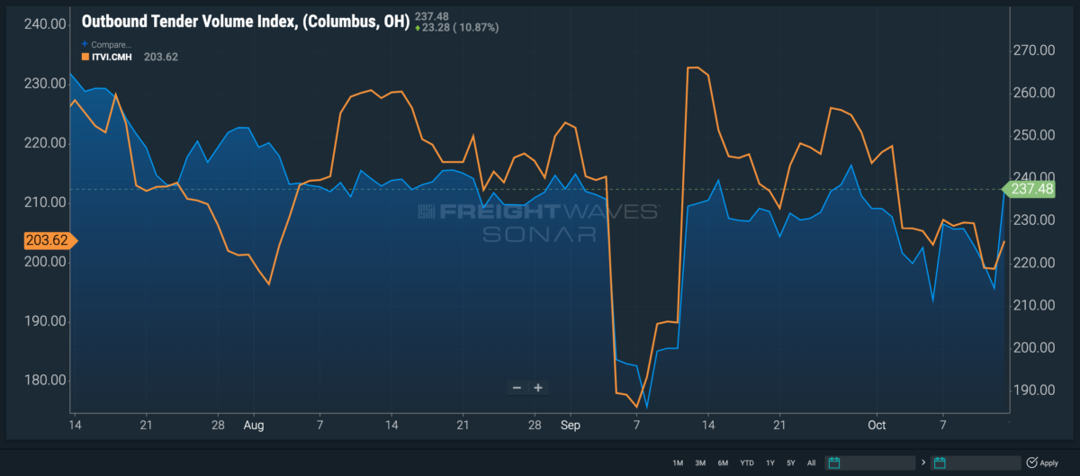 The Outbound Tender Volume Index for Columbus jumped 23 points, or 11%, on Thursday to 237.4 — roughly the value it has been since late July. Columbus hasn’t experienced much change in the past few months, only seeing a 0.65% increase in outbound volume on a two-week basis.