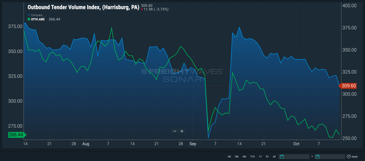 Harrisburg has seen a decrease in outbound demand by 17.6% since Sept. 14 and is still pointing in a downward trajectory heading into the weekend. Harrisburg’s neighboring market, Allentown, Pennsylvania, is experiencing the same trend, with outbound volumes dropping 14.4% since this time last month.