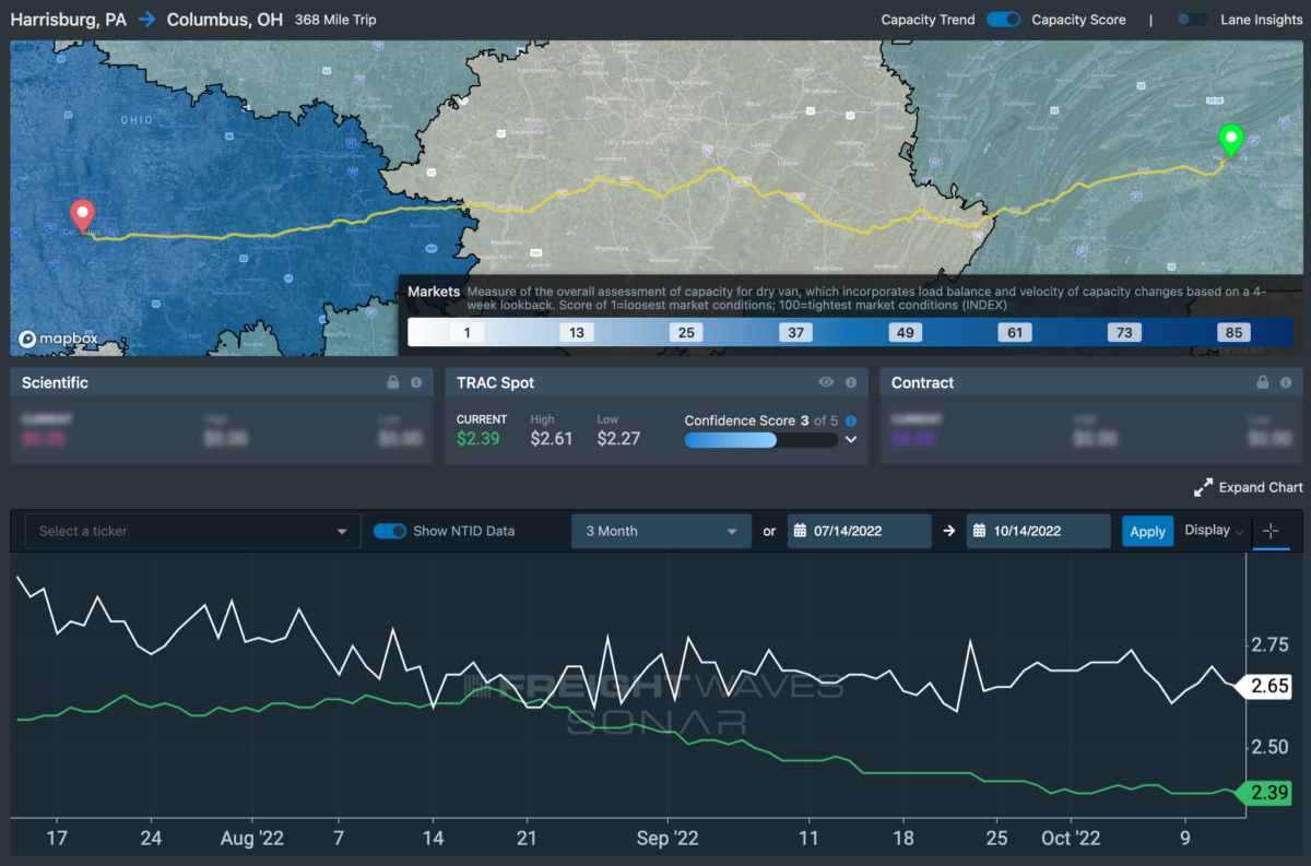 Spot market rates from Harrisburg to Columbus are still where they were at the start of the week at $2.39 a mile — 26 cents below the national average. Outbound demand in Harrisburg is on a steady downward trend, and taking a relatively lower rate here can help put carriers into a market that is seeing increased outbound volume.