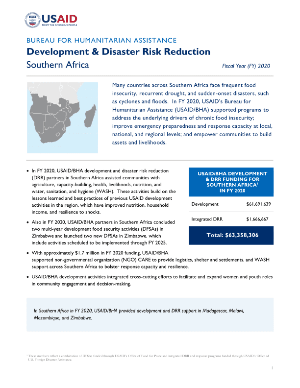 In Southern Africa in FY 2020, USAID/BHA provided development and DRR support in Madagascar, Malawi,