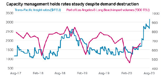 Unlike the tanker sectors, container carriers have experienced strong rates leading up to the fourth quarter due in part to their efforts at careful capacity management and the use of void sailings. A spike in demand starting in July and August as manufacturers and retailers sought to restock, while also dealing with increased demand for goods such as PPE and home-working equipment, contributed to the rates. It also created logistical challenges such as a shortage of containers.