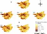 Figure 3 Spatial distribution of the overall reported incidence of TB in Guangxi, 2015–2019 (A), and annual incidence of TB reported by county (B). |