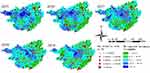 The optimal-fit Bayesian space-time model (the space-time interaction effect model) was used to analyze the socioeconomic covariates (Table 5). The model included the indicators screened by stepwise regression, which are the number of beds per 1000 population at local healthcare institutions, the number of medical and technical personnel at healthcare institutions per 1000 population, and the per capita net income of rural residents.