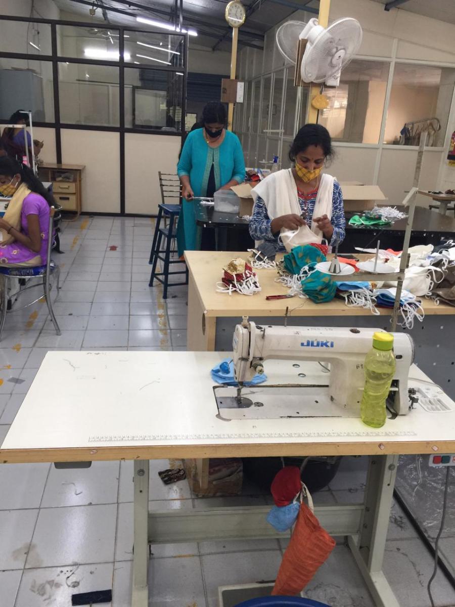 Seequence Clothing Company, a garment factory in HRBR Layout has found women who make masks suffer from backaches. The pain is caused by having to bend over during the production. The factory has been making masks since the lockdown began.