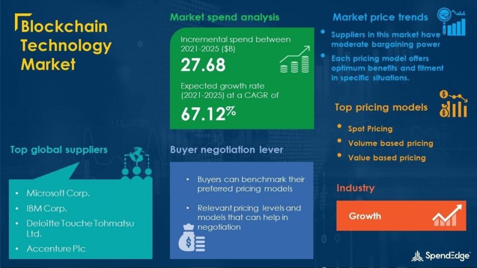 The Blockchain Technology market will register an incremental spend of about USD 27.68 billion, growing at a CAGR of 67.12% during the five-year forecast period. A targeted strategic approach to Blockchain Technology sourcing can unlock several opportunities for buyers. This report also offers market impact and new opportunities created due to the COVID-19 pandemic . Download free sample pages