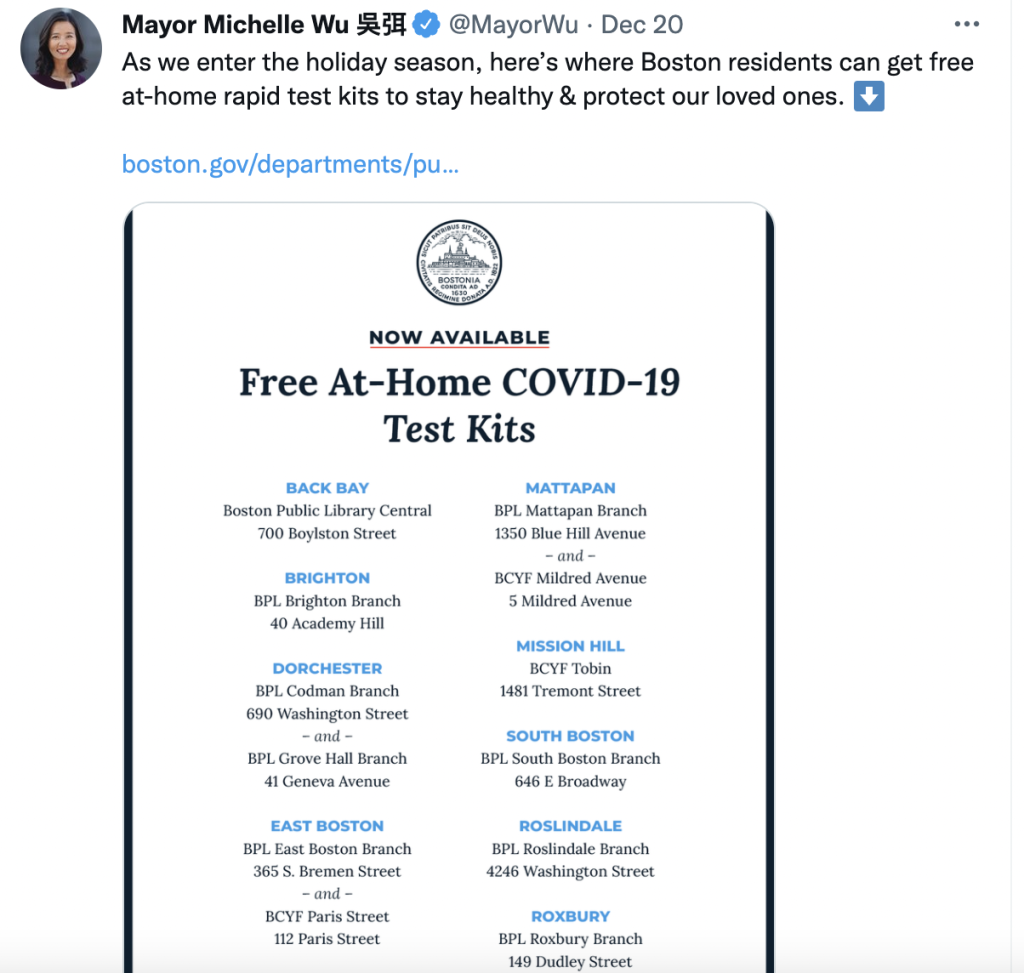 Earlier this month, more than 100 cities and towns were given free rapid COVID test kits to distribute to help stop the spread of COVID during the Christmas season by the Baker-Polito administration.