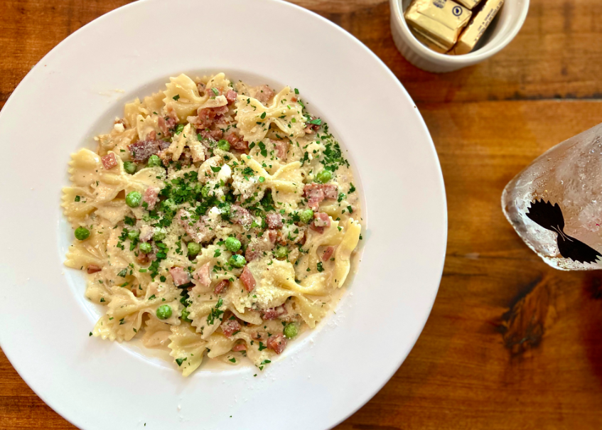 She is referring to the pasta dish listed only as Farfalle. The sparse description beneath the listing—prosciutto, peas, parmesan cream—belies the big problems this pasta can cause if consumed without supervision. Diced prosciutto and peas populate the empty spaces between the bowtie pasta, and the whole dish is practically drowning in the parmesan cream sauce, itself so decadent and full of flavor it should come with a warning label. The pasta, cooked perfectly al dente, is the only thing that keeps you from guzzling the sauce down on its own, though if you can muster any self-restraint, the leftover liquid gold is well suited to fare la scarpetta all the way to rehab.