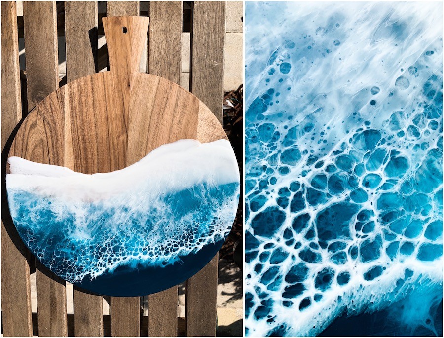 While a good bit of Dominika’s collection can hang on the walls as alluring artwork, many of her other pieces also act as daily-use products. Whether a cutting board, serving tray/platter, dish bowl, longboard or skateboard, the freeform waterscapes are artful reminders to never move to a state that is landlocked. “My mission is to show you the beauty of nature—contemplate its colors, motion, texture and how it affects you,” she says.