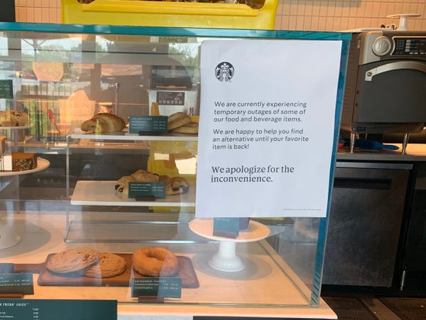 Some stores also displayed signs that say “we are currently experiencing temporary outages of some of our food and beverage items.” These signs were officially distributed from Starbucks corporate to individual stores, the spokesperson confirmed.