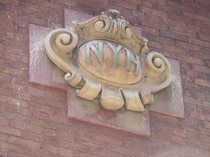 The other NYH building is on the west side of Staple St. at #9 Jay St. It was built in 1907 as a laundry building and stable serving the House of Relief on the opposite side. Somehow, a terra cotta shield cartouche bearing the initials N.Y.H. has survived, despite several building renovations over the years. It resembles similar shields found in older NYC subway stations, built in the same decade as this NYH annex, that carry the initial letter of the station stop.