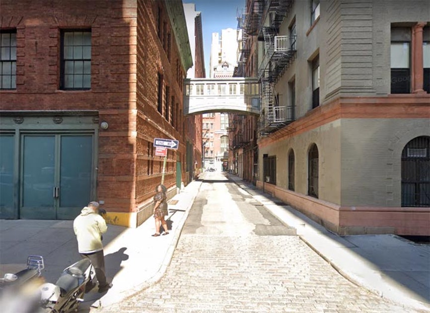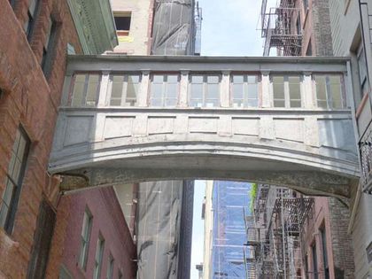 The element that has attracted me to Staple St. for two decades is its bridge. It’s made of cast iron and has picture windows along the sides, and connects the third floors of the House of Relief with the laundry/stables. Tribeca West’s Landmarks Designation Report states merely that it’s a “later addition, designer undetermined” but it can be no older than 1907. I suppose I’m fascinated with it because while there are many older or more recent pedestrian footbridges connecting buildings around town, they’re usually high above the street, and this one spans one of NYC’s more obscure alleys. It’s Staple St.’s trademark—its hidden nature has saved it.