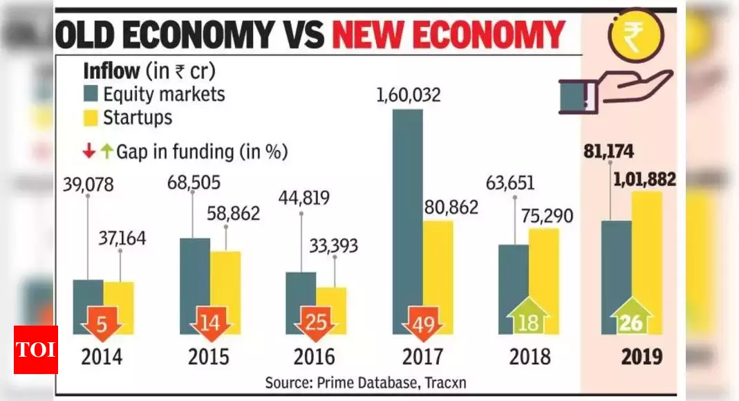 The continuing expansion of the difference underlines the slowdown in the overall economy, hitting sectors like fast moving consumers goods (FMCG), even as technology startups have been able to mostly buck the trend till now. Back in 2017, which was the last time when total capital flows into startups had set a record high, equity markets were able to mop up double that amount (see graphic).