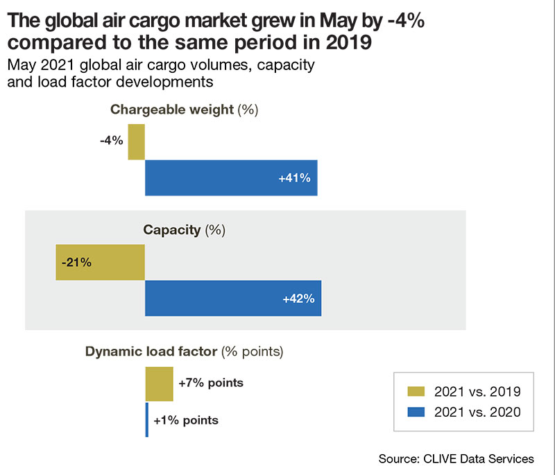 May 2021 data versus the same month of 2020, when COVID restrictions caused severe disruption to the global aviation market, show +41% growth in chargeable weight, a +42% rise in available capacity, and +1% point increase in dynamic loadfactor. The “dynamic loadfactor” measures how full an aircraft is by considering both freight volume and weight.
