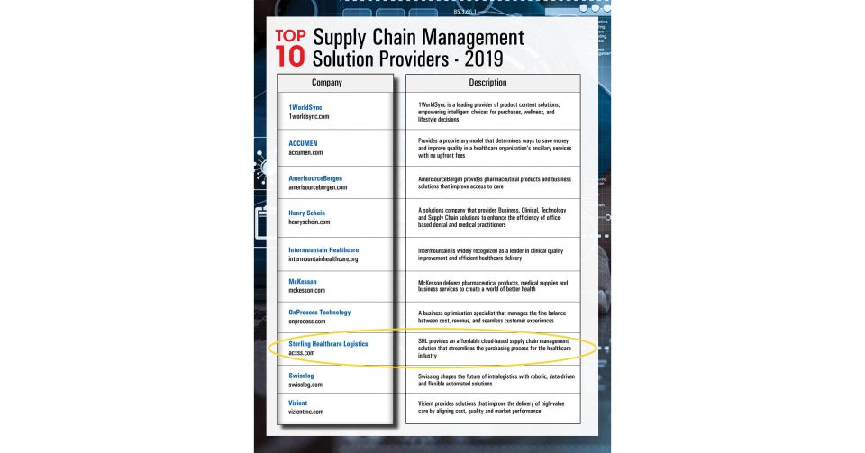 Sterling Healthcare Logistics is recognized by Healthcare Tech Outlook as one of the Top 10 Supply Chain Management Solution Providers of 2019, among industry giants such as McKesson and Vizient.