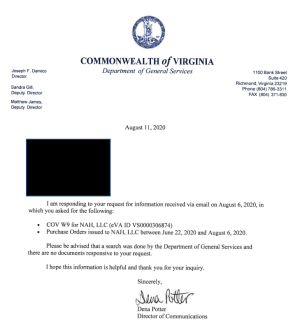 A search for NAH purchase orders and contracts during the last quarter year turned up a blank. The lack of such an order is confirmed in a DGS response to a Freedom of Information Act request by my collaborator, who does procurement work for a state agency and asks to remain unidentified. A redacted image of that letter appears above.
