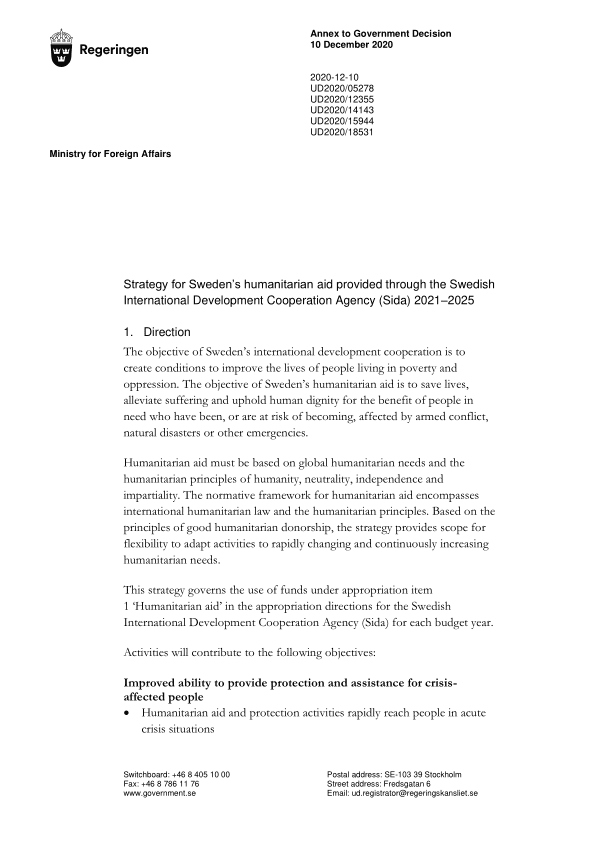 The purpose of the strategy is to manage Sweden’s humanitarian aid via the Swedish International Development Cooperation Agency (Sida). The overall objective of Sweden’s humanitarian aid is to save lives, alleviate suffering and maintain human dignity for the benefit of people in need who have been, or are at risk of becoming, affected by armed conflicts, natural disasters or other disaster situations. The strategy applies during the period 2021–2025 and covers the funds allocated in the appropriation directions of Sida for each budget year.