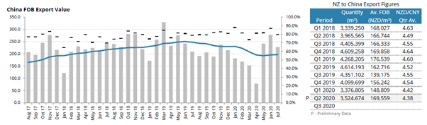 Quarterly log sales to China are shown below. Note the reduced average FOB value in Q1 2020 which lifted again for Q2 2020. New Zealand exported more logs in Q2 than in Q1 despite the lockdown covering one week at the end of Q1 (starting March 25th) then most of April in Q2 (lifting April 27th).