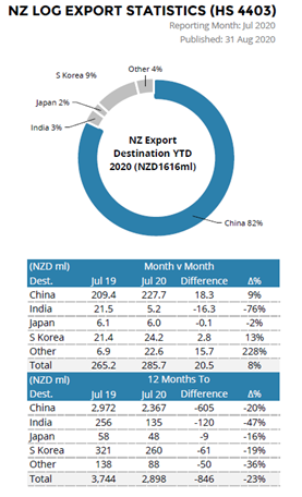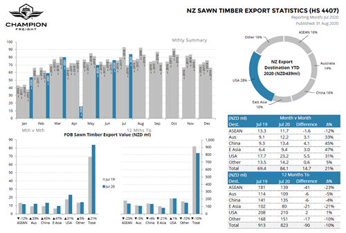 The export destinations for sawn timber are displayed below. Export sales for the 12 months ended July 2020 were 10% down on the 12-month period ended July 2019.