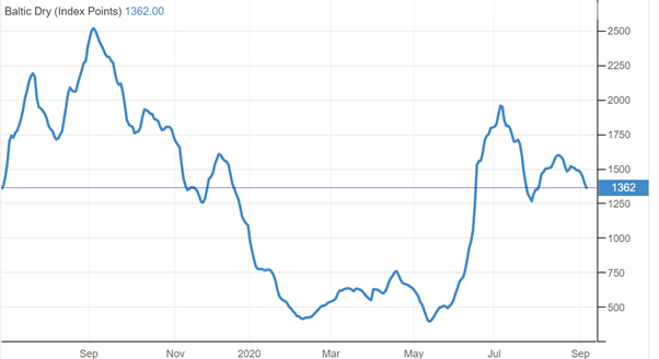 Ocean freight rates have steadily increased over the last few months as the demand for iron ore and other minerals has increased. As well as the previously mentioned iron ore imports, China imported 666kt of primary copper in August which was a 65% increase year on year. Port congestion in China is across all vessel categories, tankers, breakbulk and containers. Some estimates are that up to 7% of the fleet capacity of Capesize vessels is waiting at ports. The port congestion in China is contributing to a tightening of vessel supply.