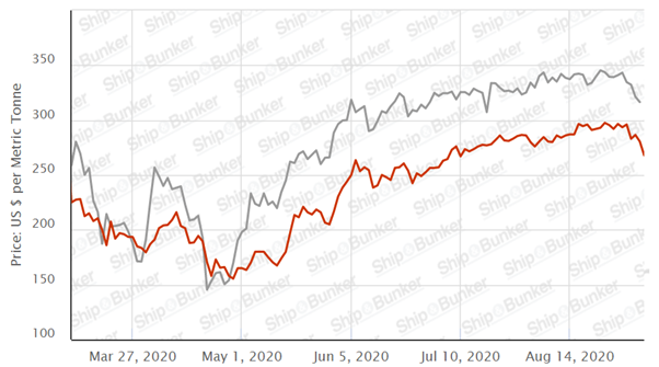 Singapore Bunker Price (IFO380) (red line) versus Brent Oil Price (grey line)