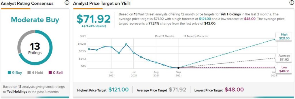 Turning to Wall Street, Yeti Holdings has a Moderate Buy consensus rating based on nine Buys and four Holds assigned in the past three months. At $71.92, the average Yeti Holdings price target implies 71.2% upside potential.