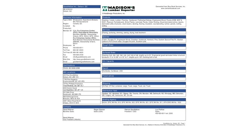 VANCOUVER, British Columbia & CAROL STREAM, Ill.–(BUSINESS WIRE)–The annual data update of Madison’s Sawmill Lumber Directory Listings is complete and live online. Be among the first to subscribe and gain access to this worthwhile knowledge base! The integration of Madison’s Sawmill Directory with Blue Book Services’ Lumber Blue Book is now available for you.