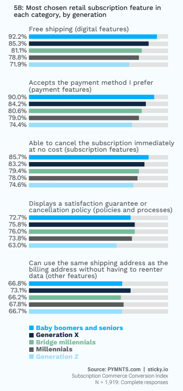 The youngest consumers — those in Generation Z — ranked the three features in a different order. For these consumers, being able to cancel the subscription immediately at no cost is the most important feature (cited by 75% of Gen Z consumers), followed by being able to use the payment method they prefer (74%) and free shipping (72%).