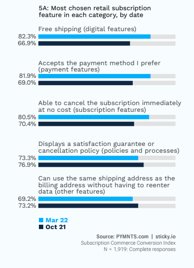Eighty-two percent of respondents to the March survey said free shipping is a desired retail subscription feature, up 15 percentage points from the 67% who said the same in October.