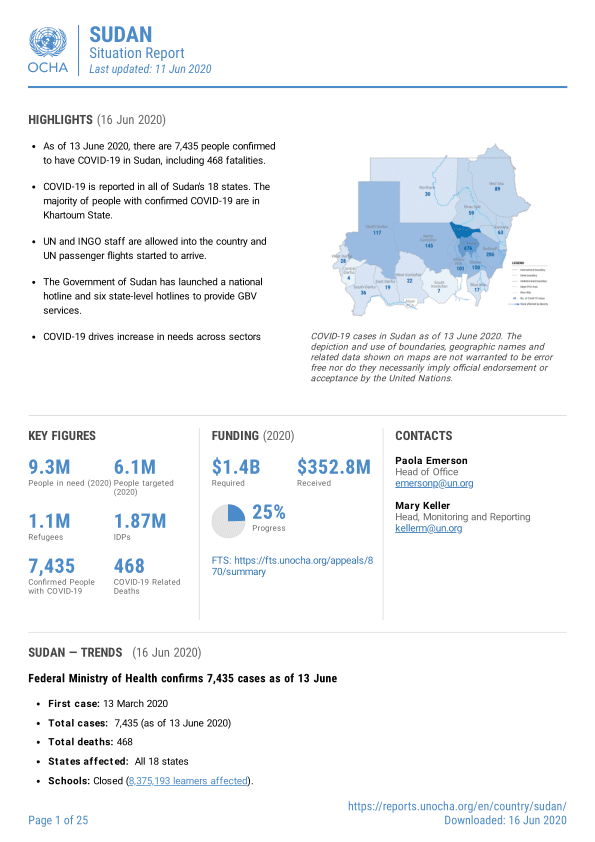 As of 13 June 2020, there are 7,435 people confirmed to have COVID-19 in Sudan, including 468 fatalities.