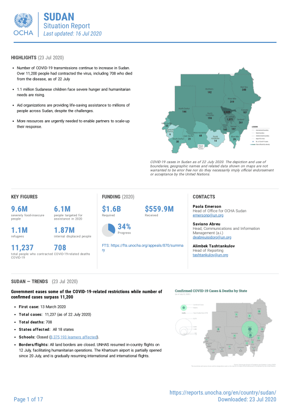 - Number of COVID-19 transmissions continue to increase in Sudan. Over 11,200 people had contracted the virus, including 708 who died from the disease, as of 22 July