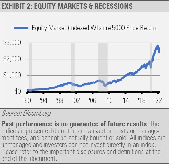 We can compare the current equity market environment to previous recessionary environments to judge how much recession risk is already priced into these markets. While each recession and the equity market’s response is different, we can still use the data to help form our expectations regarding the potential outcomes. The NBER has identified four recessions since 1990. These four identified recessionary periods are (1) August 1990 to March 1991, (2) April 2001 to November 2001, (3) January 2008 to June 2009, and (4) March 2020 to April 2020 (exhibit 1). Comparing the monthly Wilshire 5000 Index price returns to the NBER defined recession periods (peak to trough, and before the economy begins a new growth cycle), we find the following: