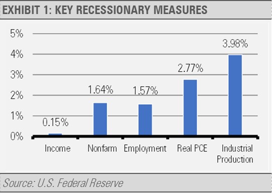 As a result, recessions are a period of falling production, sales, income, and employment that usually lasts more than a few months. Looking at these measures can give us a better understanding of whether the business cycle is in an expansionary or recessionary phase. The following is a sample of current year-to-date data that the NBER uses to determine the phase of the business cycle, sourced from the U.S. Federal Reserve: