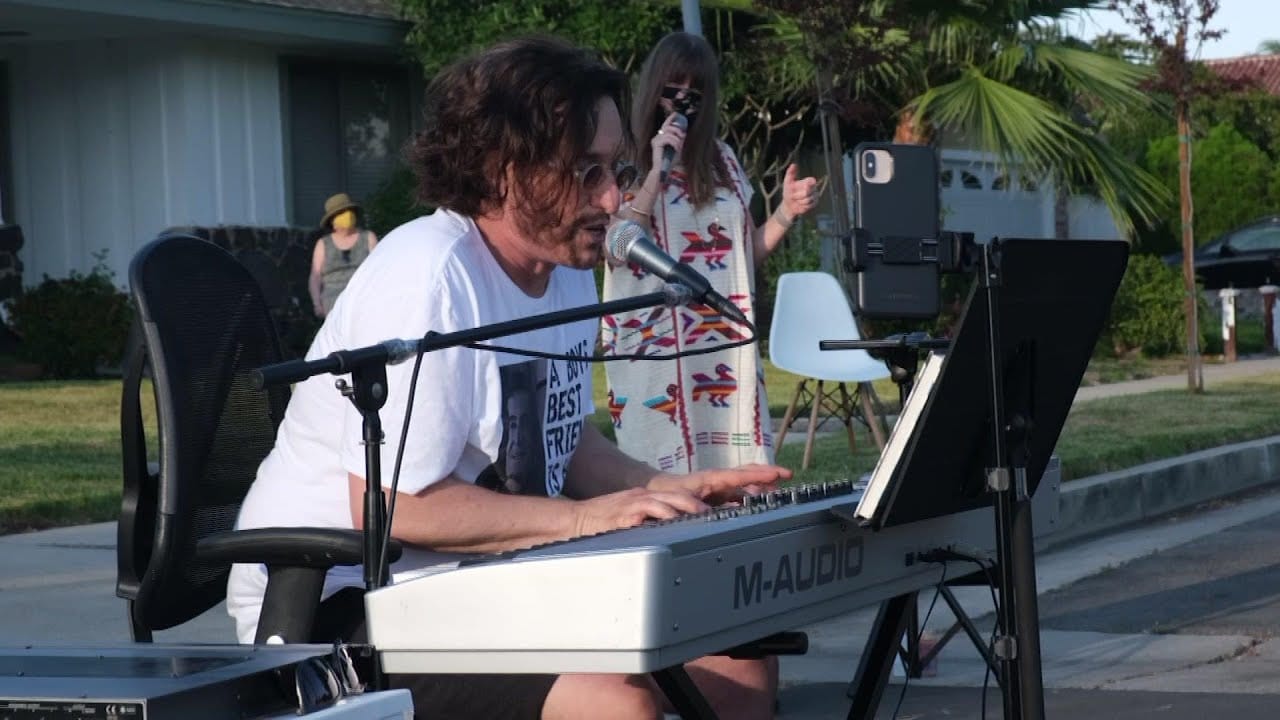 With a bit of Beatles and a lot of Elton John, Adam Chester is bringing good vibes to his locked-down Los Angeles neighborhood with weekly concerts. Image via AP.