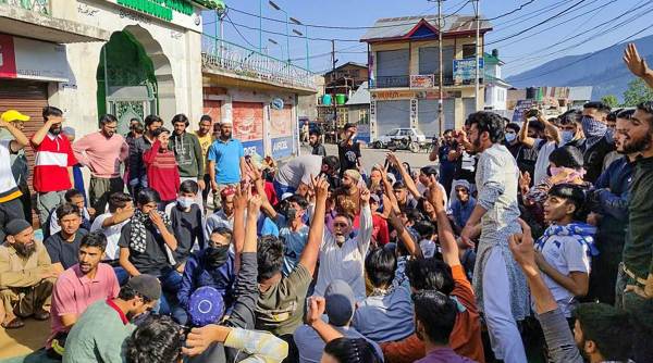 People stage a protest over the controversial remarks made by two now-suspended BJP leaders about Prophet Mohammad, at Bhaderwah in Doda district, Friday, June 10, 2022. (PTI Photo)