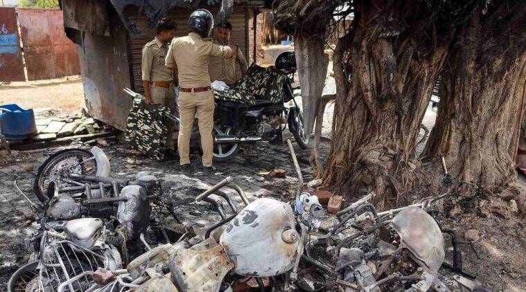 Charred remains of police vehicles in Prayagraj, Saturday, a day after clashes during protest against now-suspended BJP leader’s remark against the Prophet. (PTI)